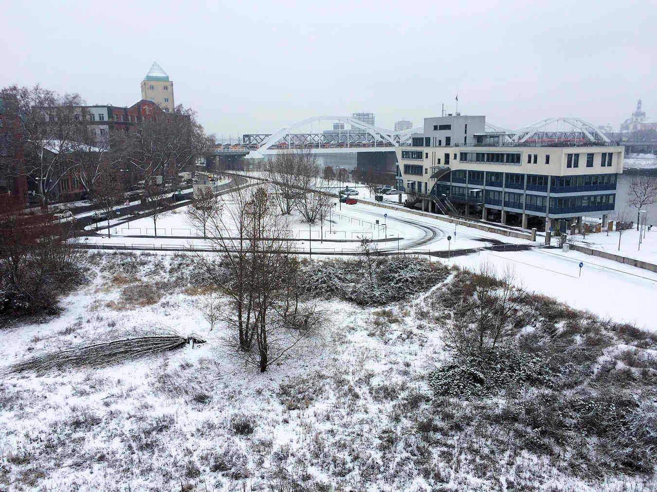 Links der "Schneckennudelbrücke", hier im Anschnitt, wurde ab dem Jahr 2019 weiter gebaut: s. Hafenpromenade im neuen Fenster.
